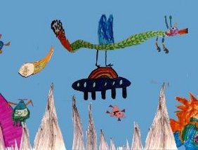 Im Kinderhaus Mathilde haben die Künstler:innen Stella Springhart und Anton Hantschel mit den Kindern ein Wandgemälde gestaltet das in der Innenstadt zu sehen sein wird (siehe Foto: Ausschnitt der Entwurfsskizze).